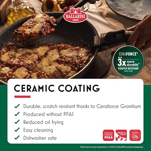 Cook with confidence thanks to the innovative CERAFORCE Granitium ceramic coating. This durable, PFAS-free surface supports low-fat cooking while offering up to three times more durability compared to previous ceramic coatings. Its patented bimetal base ensures fast, even heat distribution, turning frying and stewing into effortless culinary experiences. Easy to clean and dishwasher safe (pans and pot), this Ballarini set is built with both performance and sustainability in mind.
