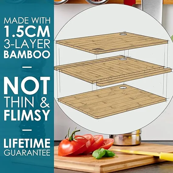 • Crafted from high-quality bamboo, these extra-thick chopping boards provide a robust, knife-friendly surface that resists warping and cracking.