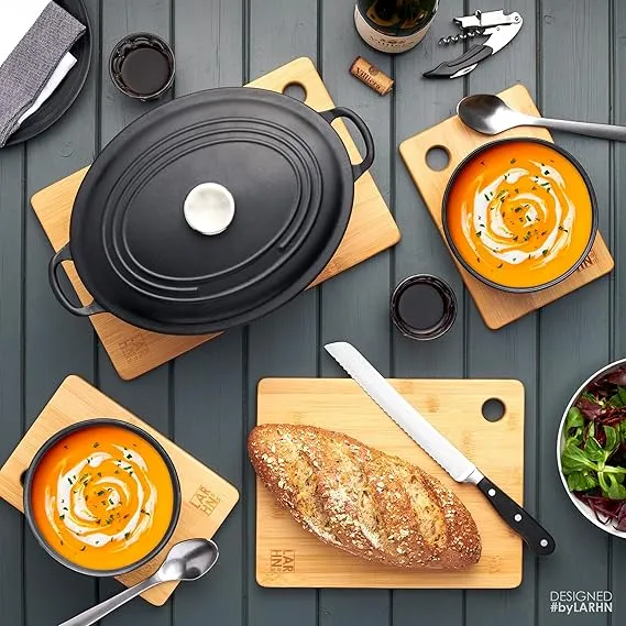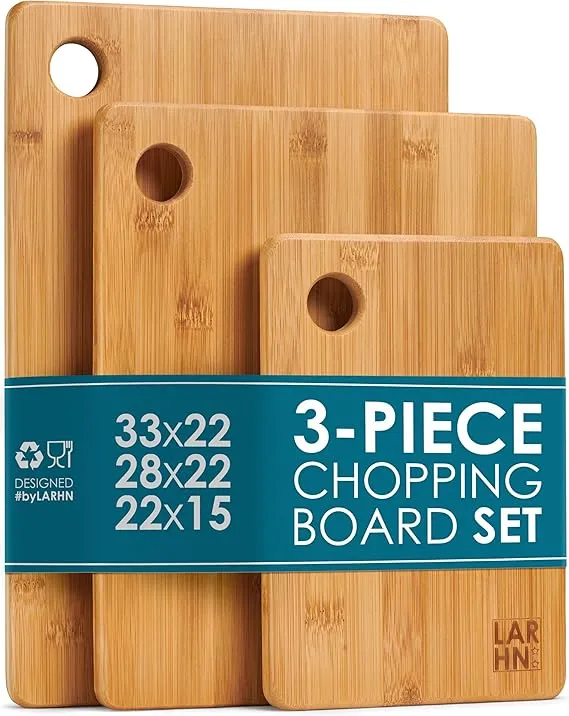 Upgrade your kitchen prep with the Premium Extra-Thick Bamboo Chopping Board Set by LARHN. This 3-piece set features sturdy, eco-friendly wooden boards in versatile sizes (33x22cm, 28x22cm, 22x15cm) perfect for all your chopping, slicing, and carving needs. Ideal for meat, vegetables, cheeses, and bread, these boards combine durability with practicality for everyday UK kitchen use.