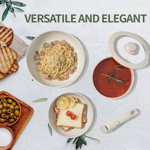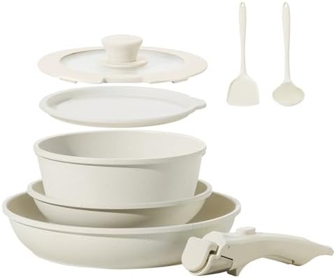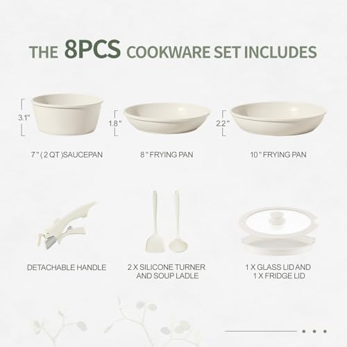 The 8-piece set includes two frying pans (8 and 10 inches), a 7” 2QT saucepan with both glass and fridge lids, detachable handle, silicone turner, and soup ladle. Suitable for induction cooktops and oven safe, it addresses all your culinary needs—from stovetop frying to baking and even serving. Whether you’re cooking a quick breakfast or hosting a family dinner, this cookware offers durability and versatility for any kitchen lifestyle.