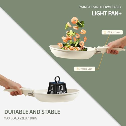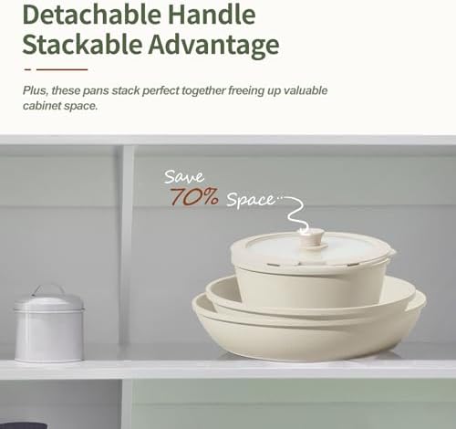 This cookware set comes equipped with a professionally tested detachable handle system, offering a secure and stable lock without the risk of wobbling. Remove the handles during cooking to prevent overheating and discoloration, and easily nest the pots and pans for up to 75% space savings in your kitchen cabinets or RV storage. The stackable design combined with fridge-safe lids makes it perfect for meal prep and storage.