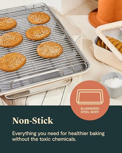 Upgrade your kitchen with the Caraway Nonstick Ceramic Bakeware Set featuring 11 essential pieces designed for baking enthusiasts and home chefs alike. Crafted with an aluminized steel body and finished with a naturally non-stick ceramic coating, this set ensures easy food release and reduces the need for excessive oils or sprays. From baking sheets to muffin pans and cooling racks, each item offers durability and versatility for a wide variety of recipes.