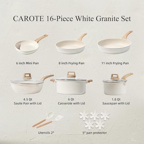 Enhance your cooking experience with the CAROTE 16-Piece Cookware Set, designed for both amateur cooks and kitchen pros. This versatile set includes everything you need for daily meal preparation: three frying pans (6″/8″/11″), a 4.5QT sauté pan with lid, a 6QT casserole pot with lid, a 1.8QT saucepan with lid, two utensils, and five pan protectors. Crafted from reinforced die-cast aluminum, these pots and pans ensure even heat distribution without hot spots, allowing your food to cook evenly whether you’re boiling, simmering, or reheating.