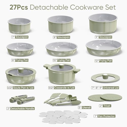 Experience versatile cooking with the CAROTE 27-piece ceramic cookware set featuring 8 inch, 10 inch, and 12 inch fry pans, multiple saucepans, a sauté pan, stockpot, and universal lids. This set also includes essential kitchen utensils like a fish turner, solid turner, ladle, tongs, and potato masher, plus pan protectors and detachable handles for convenient storage and handling.