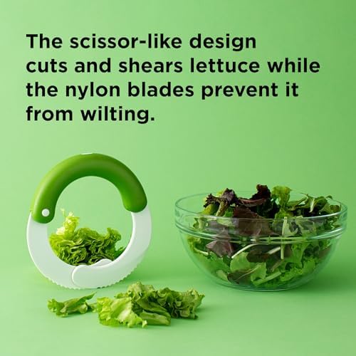 Equipped with serrated nylon blades, the SaladShears prevent wilting by maintaining the freshness of your greens after chopping. The rubber handle ensures a secure and comfortable grip, making it easy to rock the chopper back and forth either on a cutting board or directly in a bowl. Like a mezzaluna, the SaladShears create perfectly bite-sized pieces, keeping your salads fresh and delicious longer.