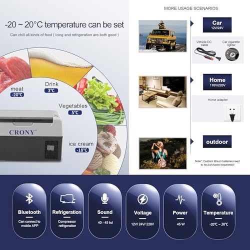 Equipped with 12V/24V dual voltage compatibility and APP control, the CRONY car fridge delivers ease of use and convenience. Its fast cooling compressor technology can even freeze ice cubes, making it ideal for extended outdoor activities. Compact and portable, it’s perfect for picnic outings, fishing trips, or any mobile lifestyle seeking dependable refrigeration wherever you go.
