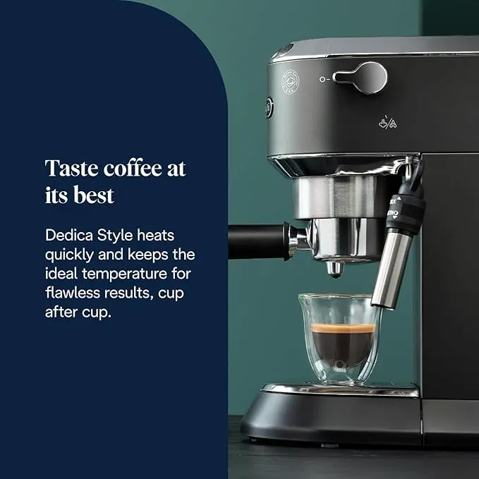 • Built with trusted De’Longhi craftsmanship and a stylish black finish, the Dedica Style offers reliable performance, an adjustable cup tray for various mug sizes and effortless everyday use.