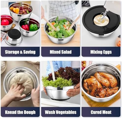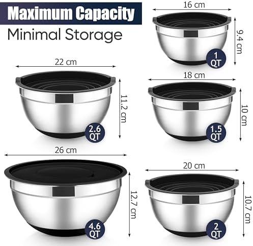 The bowls have soft silicone bottoms to prevent slipping, making mixing easier and safer while protecting your countertop from scratches. The ergonomic design allows all bowls to nest inside each other, maximizing cabinet space. Their smooth rolling rims ensure drip-free pouring, and the mirror-polished interiors deliver quick cleanup and dishwasher safety. The black exterior with a brushed finish complements any kitchen décor, enhancing both style and organization.