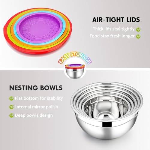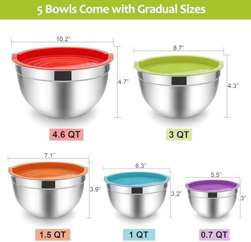 The E-far mixing bowls set includes five high-quality stainless steel bowls ranging from 0.7 to 4.6 quarts, designed with food-grade materials to ensure safety and longevity. Each bowl is rust-resistant, dent-proof, and dishwasher safe, making them ideal for everyday family use. The colorful, non-toxic plastic lids are airtight, keeping your food fresh longer, and are fridge and freezer safe.