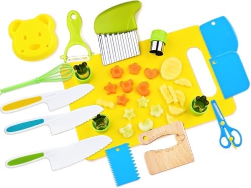 The set features 1 wooden knife, 3 serrated toddler knives, a cutting board, Y peeler, sandwich and cake cutters, crinkle cutter, egg beater, and bread sandwich shapers. Serrated edges ensure safety without compromising effectiveness, making it easy for kids to cut potatoes, carrots, cucumbers, bananas, and more. This multifunctional set is perfect for hands-on learning, helping toddlers build confidence and engage in family cooking activities.