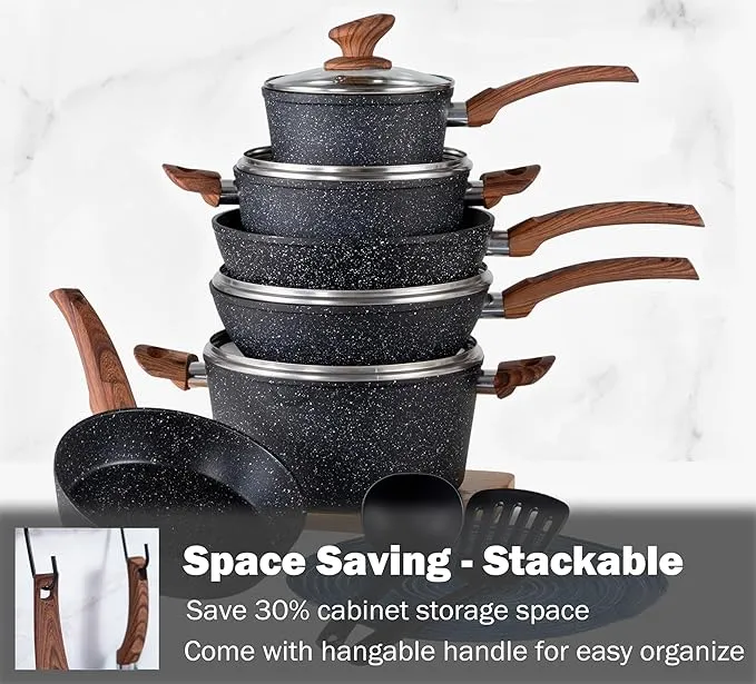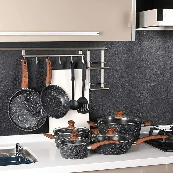 Key Features: 12-piece complete cookware set, premium black granite non-stick surface, induction-ready bases, PFOS & PFOA-free materials, even-heat technology.