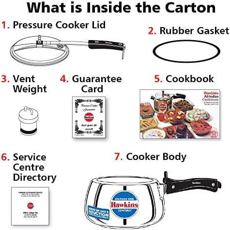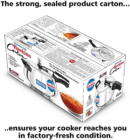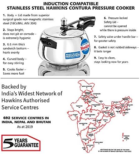 The Hawkins Stainless Steel Contura Pressure Cooker is crafted with a 100% stainless steel body and lid, ensuring long-lasting durability and resistance to corrosion. Its sleek silver finish adds a modern touch to any kitchen while providing robust performance for everyday cooking needs.