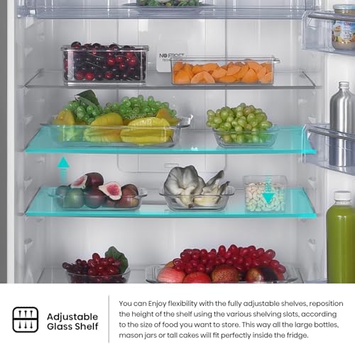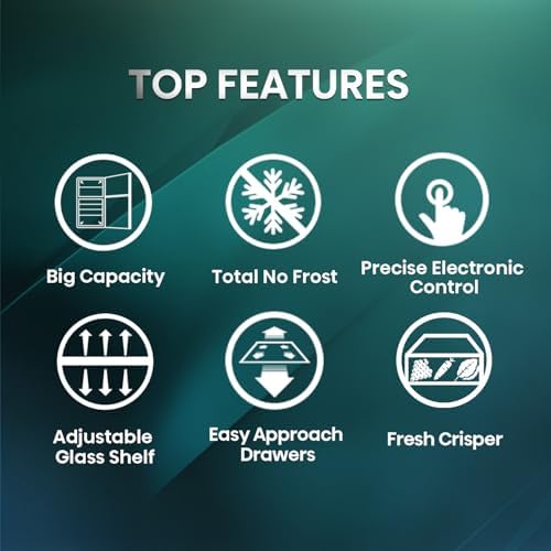 Equipped with Hisense’s innovative Total No Frost technology, this fridge prevents ice build-up by circulating cold air evenly throughout, eliminating the need for manual defrosting. The precise electronic control panel allows easy temperature adjustments and quick activation of ECO or Super Freeze modes for optimized energy use and rapid freezing. Fully adjustable glass shelves and easy access drawers provide flexible storage solutions, accommodating large bottles, jars, and taller items with ease.