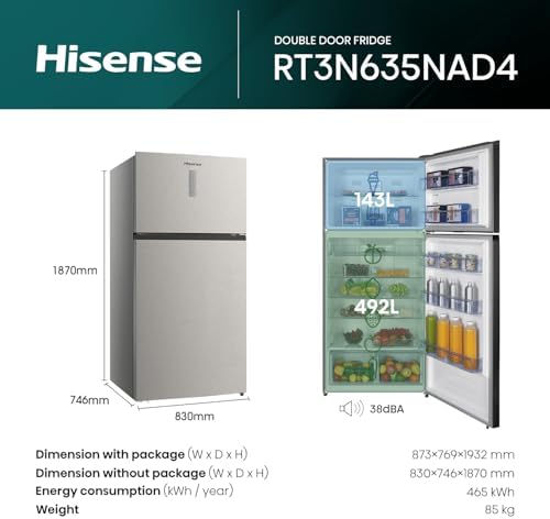The Hisense Two Door Top Mount Freezer Fridge offers an impressive 635 litre capacity, ideal for families or those who love to stock up on fresh and frozen foods. Crafted with advanced LBA foaming material, it excels in thermal insulation, ensuring your food stays fresh longer. The sleek silver finish and modern design fit seamlessly into any kitchen setting.