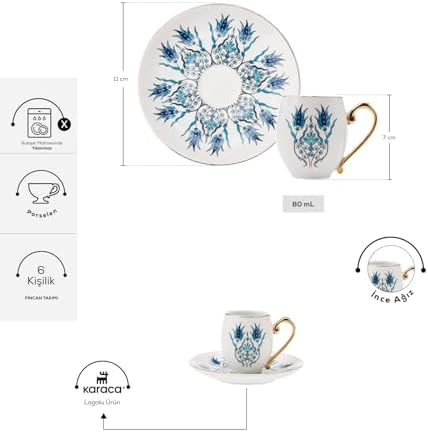 Discover the pleasure of serving traditional Turkish coffee with the KARACA Turkish Coffee Cups Set. Crafted from high-quality pro-grade porcelain, this 12-piece set includes six espresso cups and six matching saucers, designed to enhance your coffee ritual whether for relaxation, social gatherings, or special occasions. The set ensures your coffee retains the perfect foam, grounds, and sugar presentation, delivering an authentic taste with every sip.