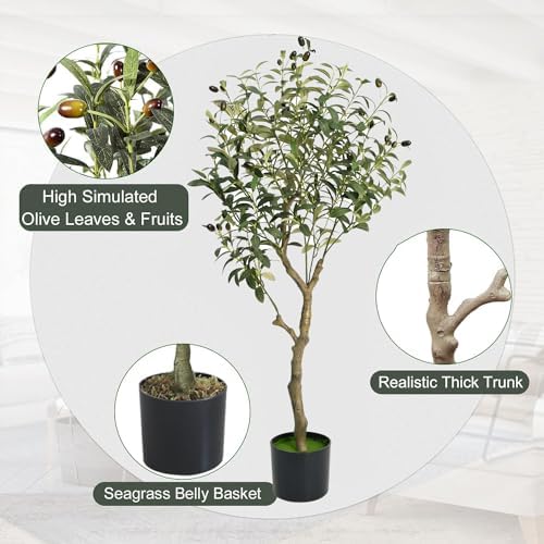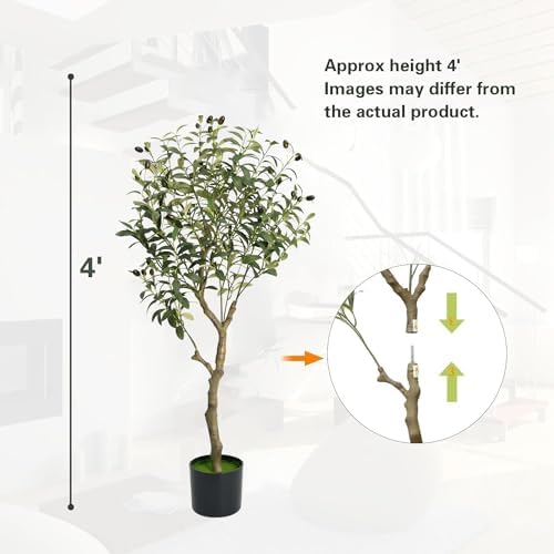 Enhance your living space with the lifelike charm of the Koeay Artificial Olive Tree. Standing approximately 4 feet tall, this carefully crafted faux olive tree features a large natural wood trunk, 504 realistic leaves, and lifelike fruits for a truly authentic appearance. Perfect for both indoor and outdoor use, it brings a touch of greenery without the hassle of maintenance. Whether placed in your living room, office, patio, or balcony, this artificial tree effortlessly complements any decor style—from rustic apartments to modern workspaces.