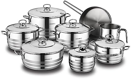The Korkmaz Astra Grande 14 Piece Cookware Set offers exceptional durability and performance for every kitchen. Crafted from high-quality 18/10 Cr Ni stainless steel, these pots and pans ensure long-lasting resistance to rust and corrosion, maintaining their polished appearance over time. The ergonomic stainless steel handles are designed for a cool, comfortable grip, making cooking safer and more enjoyable.