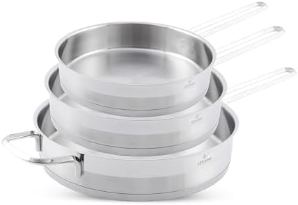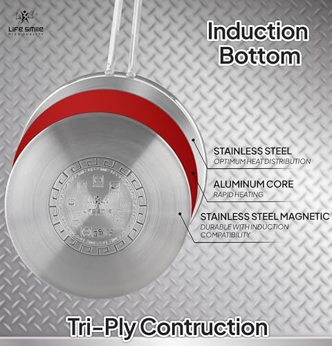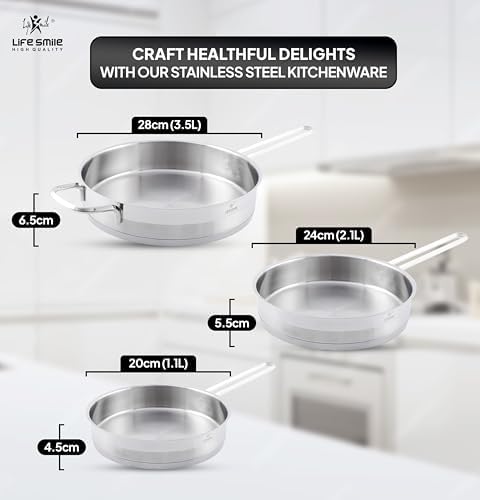 Experience cooking excellence with the LIFE SMILE Frying Pan Set, crafted from high-quality 18/10 stainless steel designed to last a lifetime. This set includes versatile pans sized 20 CM (1.1 liters), 24 CM (2.1 liters), and 28 CM (3.5 liters), perfect for everything from sautéing vegetables to frying steaks and simmering soups. The multi-layer construction ensures rapid and even heating with superior heat retention, so your meals cook evenly without hot spots.