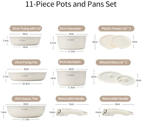 • Pieces: 11-piece set including 3 saucepans (18cm, 20cm, 26cm) and 2 frying pans