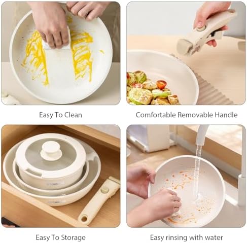 Made with PFOA-free, non toxic materials, this cookware set promotes healthier cooking with less oil and effortless food release. Its unique detachable handle system supports up to 22 pounds and allows for compact storage and a smooth transition from stovetop to oven to table. Compatible with gas, electric, and induction stovetops, this set perfectly suits any kitchen setup or even RV living.