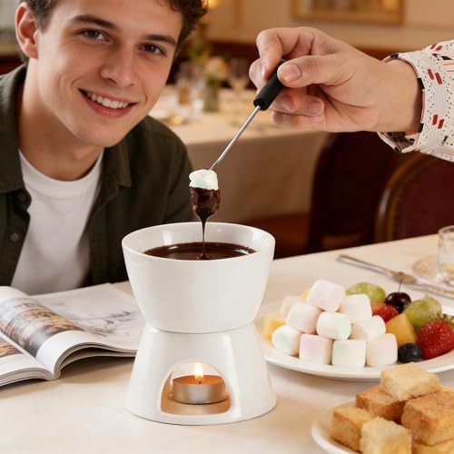 The MZSX Chocolate Cheese Fondue Pot Set is a compact and easy-to-store ceramic fondue set perfect for creating memorable dipping moments at home, restaurants, or cafes. This stylish porcelain melting pot separates into two pieces for convenient storage and includes four stainless steel forks, making it effortless to enjoy delicious chocolate, cheese, or other melted treats with family and friends.