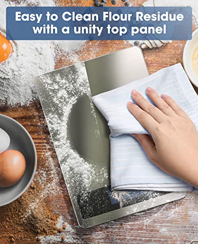 Crafted with a tempered glass platform and a sleek stainless steel surface, the scale combines durability with modern style. Its large 9 by 6.3 inch weighing platform accommodates various containers and plates, while the anti-fingerprint design keeps it looking clean and professional. The easy-to-read LCD display shows weight in grams, kilograms, pounds, ounces, fluid ounces, or milliliters, making it versatile for different needs.