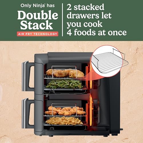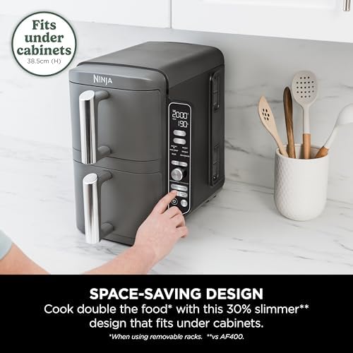 The Ninja Double Stack XL Air Fryer is designed to save you valuable counter space by being 30 percent slimmer than previous models. With a spacious 9.5 litre capacity, it easily prepares meals for up to eight people, making it perfect for families and entertaining guests. Its innovative vertical dual drawer design includes two 4.75 litre drawers and two meal racks allowing you to cook on four levels simultaneously, doubling your cooking output without crowding your kitchen.