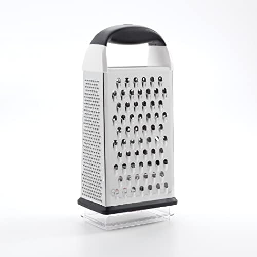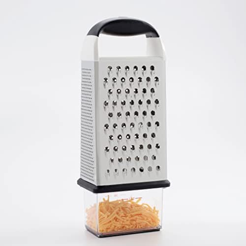 The OXO Good Grips Box Grater is designed to make grating and slicing in your kitchen easier and more efficient. Featuring sharp, stainless steel blades, this versatile grater offers multiple grating surfaces including coarse, medium, and fine options along with a slicing surface. Perfect for cheese, vegetables, and more, it can handle a variety of ingredients with ease.