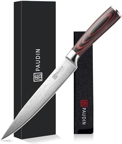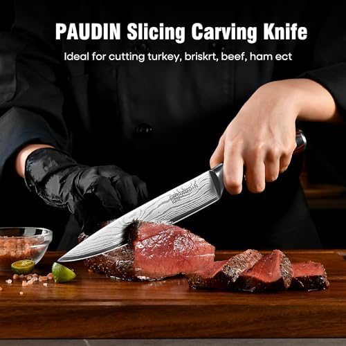 The luxury pakkawood handle is designed for balanced weight distribution and a secure grip, providing comfort and safety during extended use. This carving knife is not only a reliable tool for BBQ and kitchen enthusiasts but also a thoughtful gift presentation with its personalized box. PAUDIN stands behind the quality with a lifetime warranty, ensuring your investment in this premium slicing knife will last a lifetime.