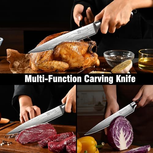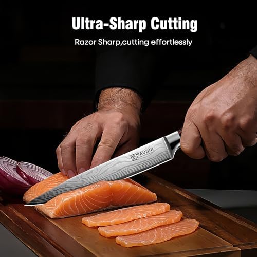 Experience exceptional carving performance with the PAUDIN 8-inch carving knife, crafted for perfection in every slice. The ultra-sharp, hand-sharpened blade with a 14-16 degree edge angle ensures clean and precise cuts effortlessly, whether you are slicing brisket, turkey, roasts, ribs, or prosciutto. Made from premium high-carbon German stainless steel, this knife offers excellent hardness at 56+ Rockwell, delivering long-lasting sharpness while resisting rust and stains.
