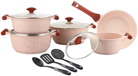 Experience effortless cooking with ergonomic bakelite handles that provide a secure and comfortable grip, perfect for safely transferring pots and pans from stove to table. The easy-release non-stick granite coating means your meals won’t stick, ensuring quick cleanups and healthier cooking with less oil. The set includes tempered glass lids so you can monitor your food without lifting the cover, locking in heat and moisture.