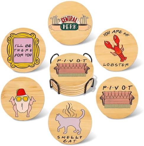 The Puluole FRIENDS Bamboo Coasters Set of 6 is an ideal gift for any enthusiast of the iconic FRIENDS TV show. Featuring classic show elements like the lobster, Central Perk coffee cup, smelly cat, and the famous sofa, this coaster set brings joy and nostalgia to any space. Whether for birthdays, housewarmings, or seasonal holidays like Christmas, Fathers Day, or Mothers Day, these coasters are a thoughtful and fun choice for close friends and family who love FRIENDS.