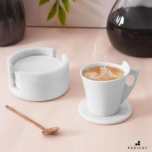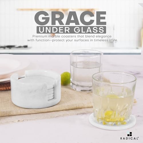 Enhance your home or office decor with the RADICALn Marble Coasters Set of 6. These premium handcrafted coasters offer a stylish way to protect your tables from water rings, scratches, and stains caused by mugs, wine glasses, or iced drinks. Each coaster measures 3.5 inch round, making them the perfect size to fit under almost any drinkware while adding a touch of sophistication to your coffee table, dining area, or bar setup.