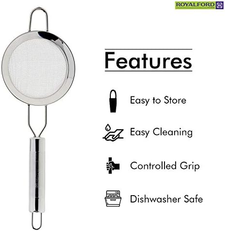The Royalford 10.3CM Stainless Steel Kitchen Strainer is a versatile tool designed to simplify your cooking and baking routine. Its fine mesh allows perfect all-purpose straining and sifting, ideal for filtering tea, coffee, milk, or seeds from smoothies. This strainer is also excellent for sifting flour and other dry ingredients, ensuring smooth textures and consistent results every time.