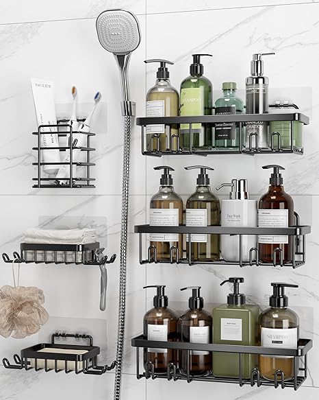 - Includes 3 shower caddies, 2 soap holders, 1 toothbrush holder, and 6 adhesives