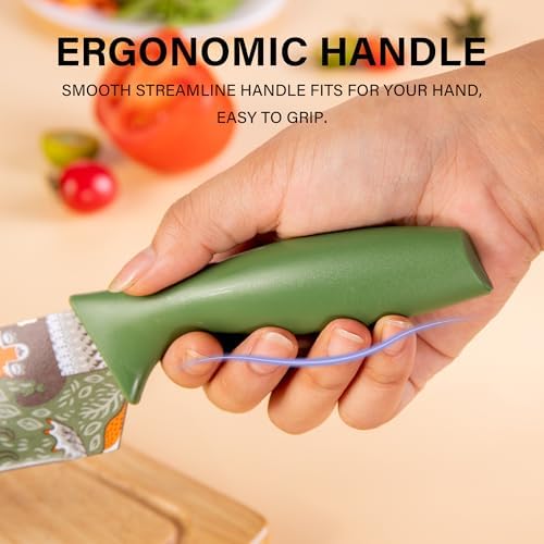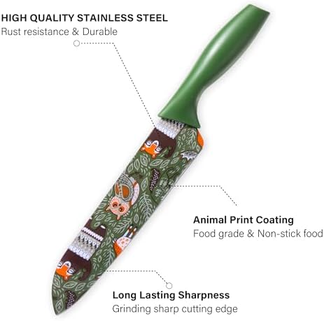 Designed with an ergonomic whale-like handle, each knife fits comfortably in your hand, reducing fatigue even during extended use. The set boasts food-grade color-coated blades with an adorable forest animal pattern in green, bringing a touch of nature and joy to your kitchen. This non-stick coating also prevents food from sticking, making cleanup effortless — simply rinse under water or place in the dishwasher.
