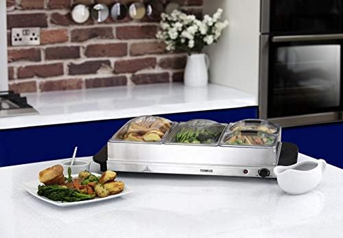 Perfect for families and entertaining guests, the Tower Four Buffet Server combines a large serving capacity with practical warmth retention. Featuring four non-stick removable trays with a combined capacity of 7.2 litres (2 x 2.4 litre and 2 x 1.2 litre trays), this server keeps multiple dishes warm simultaneously. Each tray comes with a transparent lid to preserve freshness and heat, making it ideal for parties, buffets, and large gatherings.