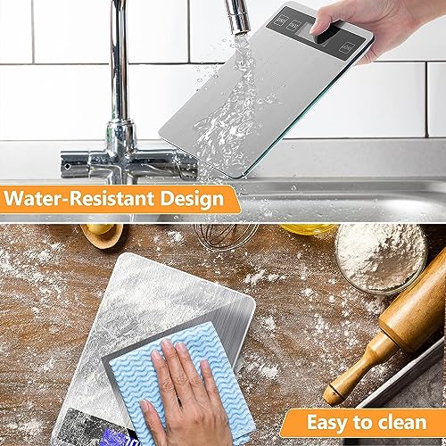 Featuring a sleek tempered glass and stainless steel panel, this slim scale is not only stylish but also water resistant and easy to clean. The user-friendly design includes just two buttons for quick tare functionality and simple switching between grams, ounces, milliliters, and pounds, displayed clearly on the backlit LCD screen for convenient reading in any lighting condition.