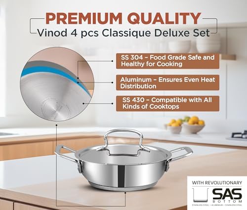 The Vinod Classic Deluxe Stainless Steel Cookware Set offers a high-quality cooking experience with its exceptional durability and design. Crafted from premium stainless steel, this 7-piece set is ideal for daily use, ensuring hygiene and easy cleaning. Its extra-thick 4.2 mm body provides long-lasting strength, making it a dependable choice for all your cooking needs.
