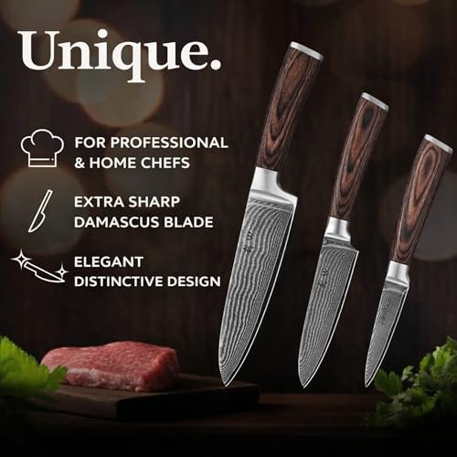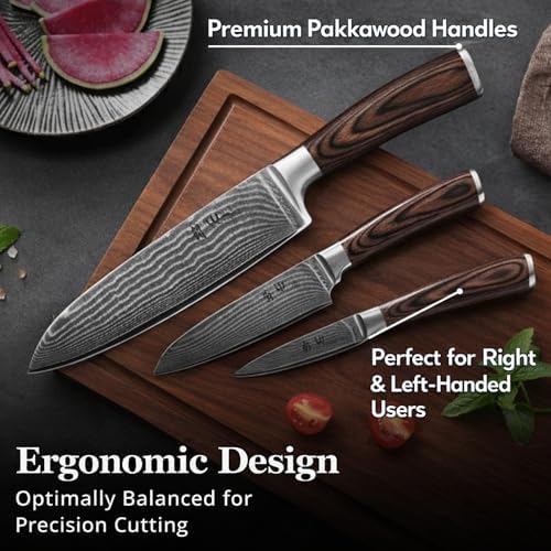 Each knife features an ergonomically contoured pakkawood handle that provides a secure, comfortable grip for prolonged use without fatigue. The balance and weight of these knives make chopping, slicing, and dicing effortless. Beyond function, the hand-finished Damascus wave pattern combined with the rich pakkawood handle offers stunning visual appeal. Packaged in a luxury wooden gift box, this set makes an ideal gift for culinary enthusiasts, food professionals, or special occasions like Eid and weddings.