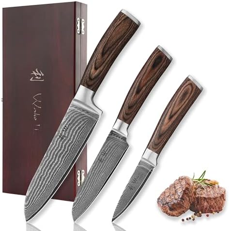 The Wakoli Damascus 3-piece kitchen knife set is expertly crafted using 67 layers of premium Damascus steel with a VG10 core, heat-treated to a hardness of 60±2 HRC. This ensures ultra-sharp blades with excellent edge retention, perfect for detailed kitchen tasks from vegetable slicing to meat preparation. The set includes a 30 inch Santoku, a 22.5 inch small Santoku, and an 19 inch office knife, covering a versatile range of cutting needs for home cooks and professional chefs alike, especially suitable for Arabic cuisine and everyday cooking.
