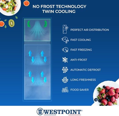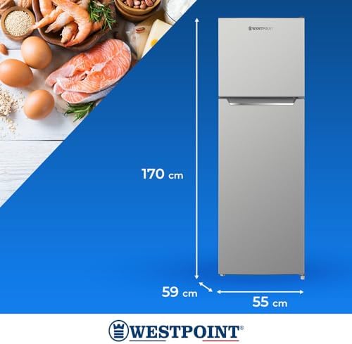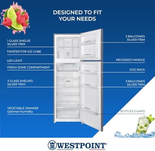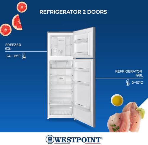The Westpoint 350 Liter Top Mount Double Door Refrigerator offers a perfect blend of capacity and style with a 350-liter gross and 251-liter net capacity. Designed to meet all your food storage needs, this refrigerator is ideal for families or individuals seeking a spacious, modern appliance to keep their food fresh and organized. Its elegant design with recessed handles adds a sleek look to any kitchen space.