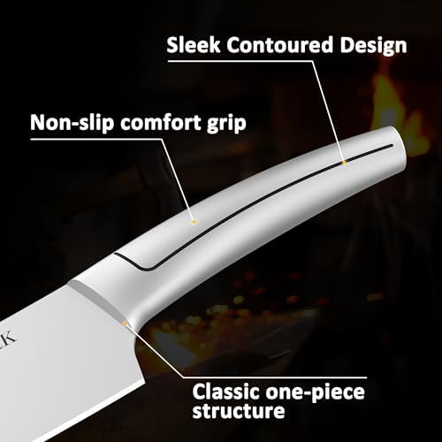 Designed with full stainless steel handles featuring a non-slip texture and built-in weighting iron, this knife set ensures a perfect balance and comfortable grip for all hand sizes. This thoughtful design reduces strain during long prep sessions, making it ideal for home chefs and professional kitchens alike.