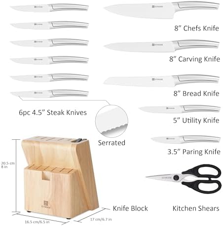 - Set Includes: Chef knife (8 inch), bread knife (8 inch), slicer (8 inch), utility knife (5 inch), paring knife (3.5 inch), 6 steak knives (4.5 inch), kitchen scissors, wooden block with built-in sharpener