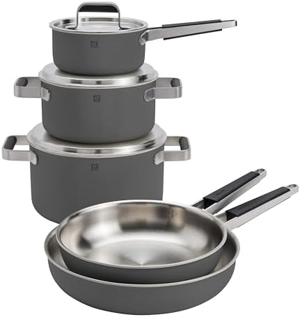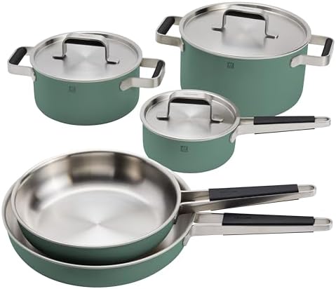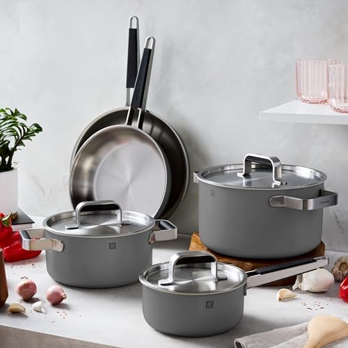 The ZWILLING Pure 8-piece cookware set combines elegant design with professional-grade materials to elevate your cooking experience. Crafted from tri-ply stainless steel with an 18/10 stainless-steel interior, this set ensures excellent durability, resistance to discoloration, and superior corrosion protection. The thick aluminum core promotes even heat distribution from rim to rim, allowing you to cook with precision and confidence on any stovetop, including induction.